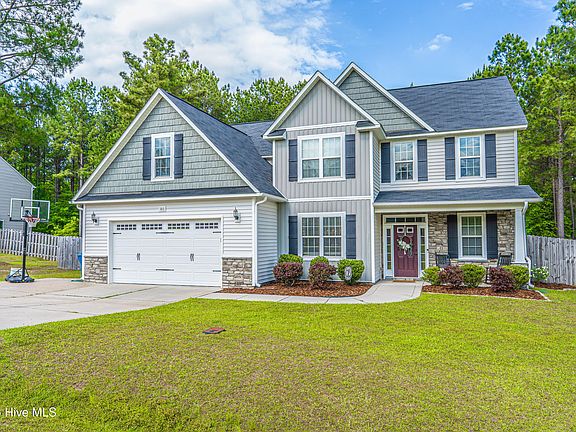 Welcome to 180 Cashew Loop, a beautifully maintained home located in the highly sought-after Forest Ridge neighborhood of Carthage. Set on an expansive 1.45-acre lot, this 4-bedroom, 3.5-bathroom residence offers over 3,000 square feet of thoughtfully designed living space where traditional charm meets modern comfort. Step into a grand two-story foyer featuring an open wood staircase that leads into a spacious great room, complete with warm hardwood floors, a cozy corner gas fireplace, and classic French doors that open to the covered rear porch. At the heart of the home is a gourmet kitchen designed for both beauty and function. Bright cabinetry paired with quartz countertops, tile backsplash, stainless steel appliances, and a generous breakfast bar with ample seating. Built-in shelving, custom cabinetry, and a charming bench add a personalized touch that enhances the home's welcoming atmosphere. The formal dining room, adorned with coffered ceilings and crisp wainscoting, provides a refined space for hosting family dinners or special occasions. Retreat to the main-level primary suite, a peaceful sanctuary with a luxurious en-suite bath featuring a large shower, double vanities, and a custom walk-in closet with built-in shelving. Upstairs, three additional bedrooms each offer spacious walk-in or double closets, along with a large bonus room perfect for a media space, home office, or playroom. Step outside to enjoy the privacy and tranquility of the beautifully landscaped backyard. A portion of the lot is enclosed with a 6-foot privacy fence while the remaining wooded area invites expansion possibilities. Perfectly positioned between New Century Middle and Union Pines High School, and just across from Fellowship Christian Academy, this home offers easy access to Ft. Liberty, Moore Regional Hospital, and all that the Sandhills region has to offer. 180 Cashew Loop is a rare blend of traditional elegance and modern design offering space, comfort, and timeless style