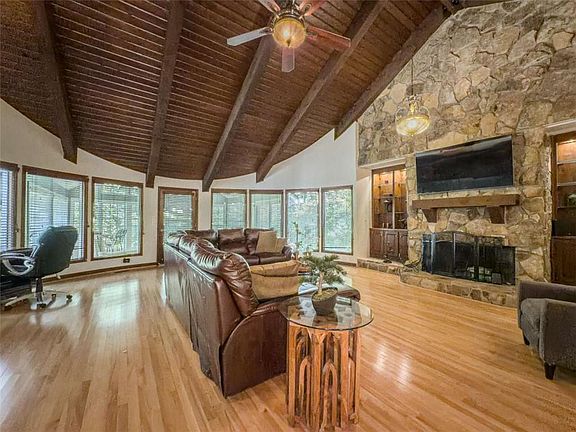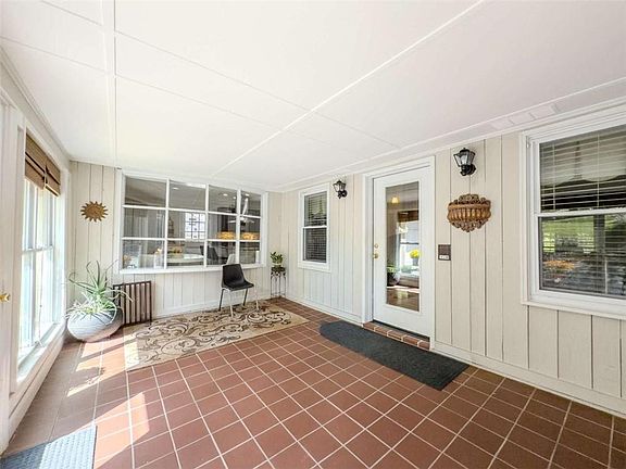 Finished basementCozy masonry fireplaceDual sunroomsAmple cabinet spacePrivate wooded backdropFlexible spaces for relaxationVaulted ceilings