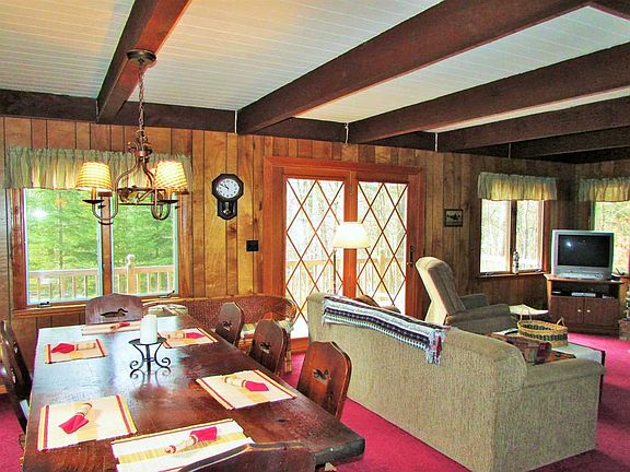 Cozy chalet privately located on Cul-de-Sac in Snow Mountain Farms. Open floor plan with living/dining area with woodburning fireplace, glass doors to spacious deck , kitchen with wooden cabinets and countertops, 1st floor bedroom, 2 upstair bedrooms one with glass doors to outside balcony, laundry hook up on 2nd floor. Area amenities include tennis court and nice indoor heated pool and club house. Close to Mount Snow and Stratton Ski Resorts.