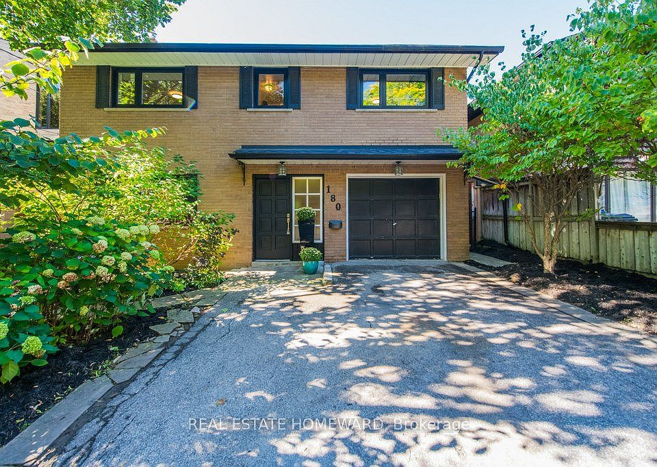 Fantastic Opportunity to live on this Coveted Street in Desirable Swansea. 180 Ellis Ave is a Solid Brick Two Story Contemporary Home on a Private Ravine & overlooking Rennie Park. Exceptional 40' x 146.87 Lot. Boasting over 1830 Square Feet + 777 Sq Ft. Finished Basement. 4 + 2 Bedrooms , 3 Full Bathrooms, Renovated Chef's Kitchen with Stainless Appliances,Large Picture Window and side door with steps to backyard . Open Concept Living /Dining Room boasts Hardwood Floors , tons of natural light , large windows & walkouts to a very private Terrace overlooking backyard , perfect for morning coffee or 'al fresco' dining . Den/Office on Main Floor is a flexible space offering a 5th Bedroom for guests and walkout to Terrace. Head upstairs to Four Large Bedrooms & Two Full Bathrooms. Primary Bedroom with private balcony overlooking backyard. Bright Renovated Basement with High Ceilings features a Lovely Rec Room perfect for movie nights with family or friends, Retro Brick Fireplace ,(currently not used) , New 3 Pc. Bathroom. Separate Den/Office offers flexible space for Guests. Large Windows & Two Walk-outs to a Patio and Private backyard backing on to a Picturesque Ravine & Rennie Park. Exceptional Lot and Fenced Backyard offers a Parklike Setting with Fantastic Tranquil Treed views. Attached Single Car Garage & Private Double Driveway for total of 4 Car Parking. This is a Beautiful Move in Ready Home , with many upgrades. Add your own personal touches! New Double Glazed Windows & Doors throughout home, Triple Glazed on Main Floor facing Ellis , Newer Furnace , Roof '24, Renovated Kitchen, New Hardwood on Main Floor, 3 Pc Bath Basement . Incredible Location offering Bloor West Village Shops & Restaurants, Beautiful High Park , Tennis Courts, Humber River, boasting some of Toronto's finest schools: Sought after Swansea School catchment & Humberside Collegiate. EZ access to Transit & Downtown