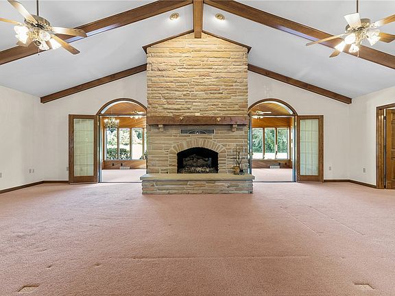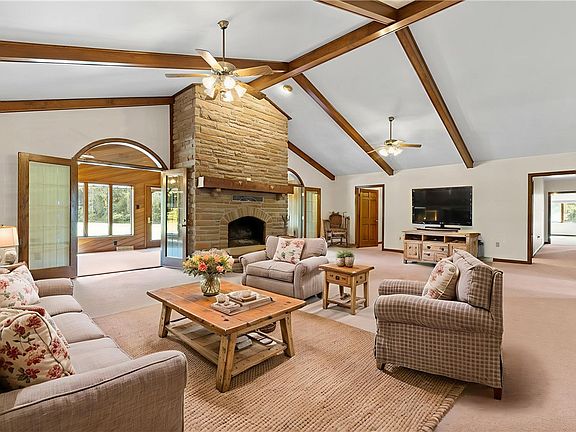 Stone fireplaceSweeping viewsFour-seasons sunroomLarge patioFour bedroomsFormal dining roomSoaring family room