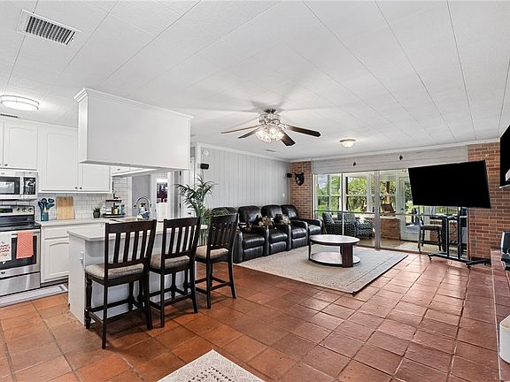 Recent updates include a garage conversion adding a large primary suite with full bath, workout room, laundry area, and storage, while still allowing space for two vehicles. The open-concept layout features a refreshed kitchen with clean white subway tile backsplash, stainless steel appliances, and a brick accent wall that adds warmth and character.