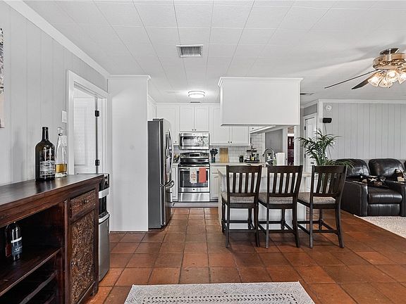 The home offers large secondary bedrooms, an updated hall bath, Saltillo-style tile flooring, light neutral interior paint, and a cozy wood-burning fireplace.