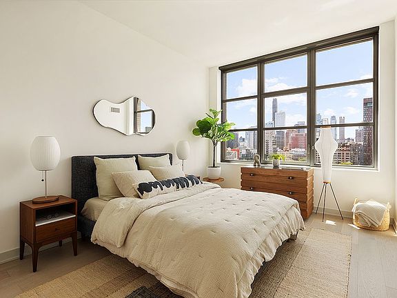 Residence 16G-FRONT is a 1,217sf light-filled two bedroom and two bathroom home offering a generously proportioned layout and immense divided light windows with sunlit southern views toward Downtown Brooklyn. Elegant and refined interiors are graced with approximately 10’ ceilings and chevron-patterned white oak flooring.