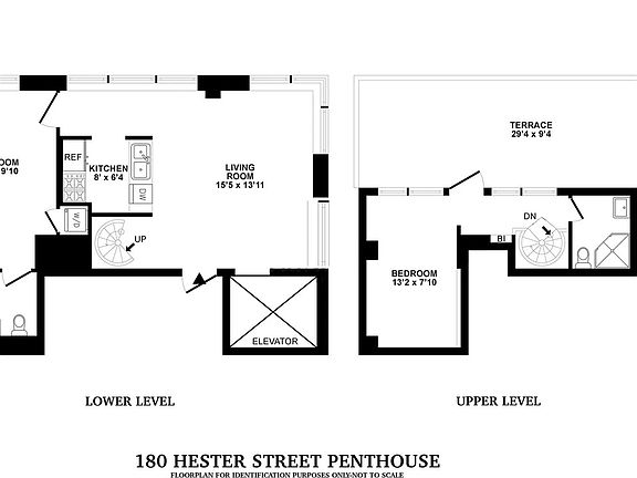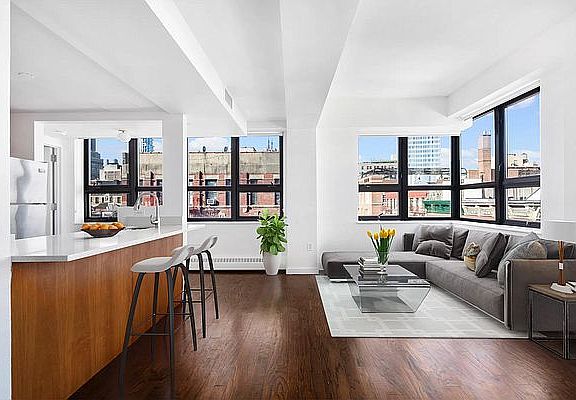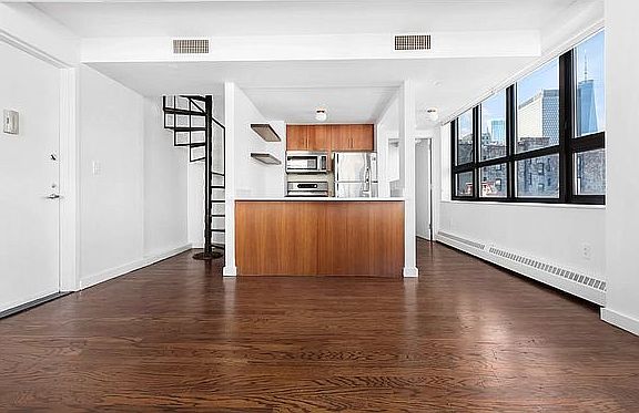 Walk into this light-filled duplex penthouse directly from the keyed elevator and you'll immediately be greeted by views you only experience in downtown Manhattan. Its 2 bedrooms, 2 bathrooms, large fully equipped kitchen, and separate washer/dryer closet will ensure staying (and working) at home is not only bearable, but preferable. Brand new gas stove installed in April 2022. Brand new waxing on the hardwood floors. If you take the cast-iron spiral staircase up, you'll find everything you could ever want from a home office: a comfortable work area with amazing views, a full bathroom, and an outside terrace to take a break and unwind. Having everything on a different floor is a great way to separate work and personal life. Of course, this floor is also fully equipped for use as a guest suite. Your terrace is on the seventh floor which is just the right height to catch a glimpse of the energy coming from the streets while still enjoying unobstructed views of the Financial District and Midtown in the distance. There are few places that are so well-connected to the rest of the city: Three subway stations within a five-block radius; Chinatown, Soho, Tribeca all minutes from your doorstep; Many of the city's most iconic restaurants within reach. Disclaimer: any staging is merely indicative and is not included with the unit. One Month's rent as brokers fee