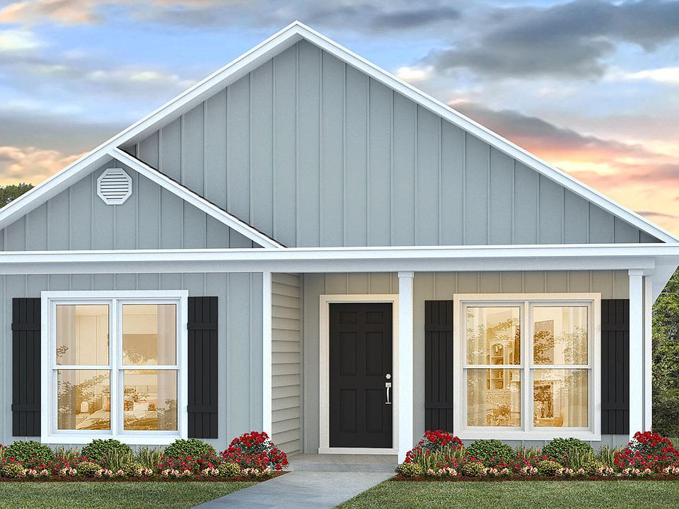 The Owl's Head community is conveniently located off of Highway 331 in Freeport. We are only 8 miles to Interstate 10, and 16 miles to beautiful beaches and Highway 30 A. We offer 6 floor plans, 3 and 4 bedrooms. All homes have rear entry garages. This community offers a community area with paved walking trails and a spring fed lake. | The Porter plan is an open floor plan with 3 Bedrooms, and 2 bathrooms. It has a covered front porch. The primary bathroom has a separate shower and large soaking tub. Elegant, engineered vinyl plank flooring in the kitchen and living area pops against granite countertops and upgraded wall to wall carpet lines the bedrooms.