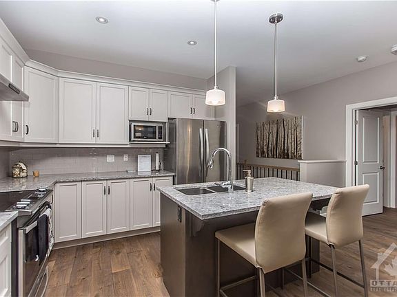 Jump the queue and purchase this soon-to-be-finished semi, located close to the river in Almonte. 2 bedrooms and 2 bathrooms on main level, with 3rd bath rough-in in the basement. Open concept, cathedral ceilings, gas fireplace, pot lights in kitchen and living room. Upgraded faux-wood vinyl floors throughout with tile in wet areas. Covered deck off the great room. Enter thru double doors to the master which has a W/T closet, 4 pc ensuite with beautiful tile, niche, and glass shower walk-in with pot light. The 2nd bedroom can be used as a den and has a large closet. The main bath is tile with niche and pot light in the shower/tub. Garage entry into main floor laundry mudroom with lots of closet space and tile floor. The kitchen is open concept with an island, level 5 quartz (highest) and white shaker cabinets. The island for contrast has a modern rustic vibe with darker cabinets. Easy access to schools, hospital, parks, waterfront, & trails. 20 mins to Kanata. To be ready end of July.