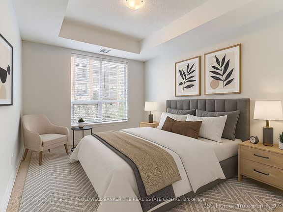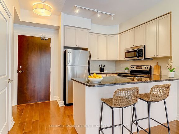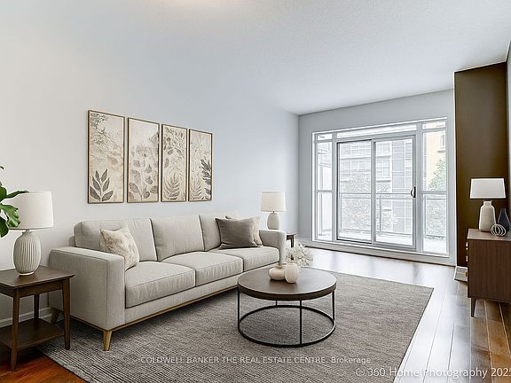 Located in the heart of Aurora, welcome to The Ridgewood, Aurora's premier luxury boutique condominium. This open concept 734 sq ft suite boasting 9' ceilings, a spacious bedroom and den that is ideal for a home office, additional storage or an extra living/sleeping space. The suite features wood laminate floors, granite kitchen counters, stainless steel appliances (fridge, stove, built-in dishwasher, built-in microwave), washer and dryer, all existing light fixtures and window coverings. The space has been freshly painted, professionally cleaned and is move-in ready. The Ridgewood offers luxurious amenities, including concierge service, an outdoor saltwater pool, meeting room, library, gym with a sauna and steam room, BBQ area, guest suites, underground parking and a locker. Nearby scenic walking trails, top amenities and recreational facilities, including the Aurora Seniors' Center, Stronach Aurora Rec Complex, easy access to Highway 404, minutes away from the GO Station, and nearby shopping centres. Heat, A/C and water are all included in the maintenance fee. Pets Allowed with Restrictions. Don't miss your chance to live the ultimate condominium lifestyle with luxurious resort-style amenities. Unit photos have been virtually staged.