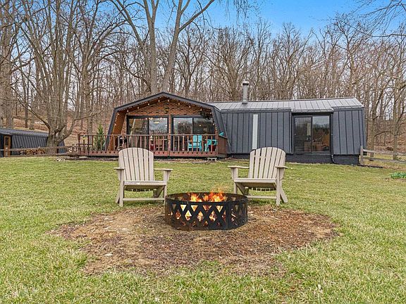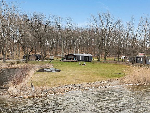 NO SHOWINGS UNTIL APRIL 5TH, DURING OPEN HOUSE!!!! This custom midcentury modern lake home was built in 1977 and has been thoughtfully restored throughout with retro touches and modern amenities. The property is situated at the end of a peaceful lane on 1.649 acres. The level yard features 187 ft of tranquil lake frontage. It includes an aluminum pier with platform extension for seating, which is prime for relaxing. The huge, fenced yard is perfect for family gatherings, kids, pets and gardening. Step inside the front door and you’ll find an impressive custom kitchen with sleek maple soft close cabinetry, glass subway tile, bar top, upgraded electrical/plumbing and stainless-steel appliances. The open concept space features 16ft of top-grade replacement sliding doors with an uninterrupted view of the lake and sunsets. The family room features a stunning custom wood wall with wood burning stove and modern tile hearth. The main bathroom highlights custom tile work, updated electrical/plumbing and a built-in for out of the way storage. Each bedroom has a new patio door with breathtaking views of the woodlands behind the property. The master features a fully remodeled half bath and custom closet. In the laundry room, you’ll find top of the line front load washer and dryer, built in cabinets and a large closet. Other noteworthy features include: angled walls, slot windows, luxury vinyl plank flooring, fresh paint and modern light fixtures throughout. Beyond the spacious yard, you’ll find a totally renovated outbuilding with a storage cellar. The light filled space has rough sawn beams, stained glass windows, rustic oak flooring and all new electrical. It is currently used as an artist's workshop, but could also make a stellar man cave or bunkhouse. The oversized 1-car garage has a full bathroom along with the well pump and newer commercial-grade water softener. Some new plumbing has been completed. This space has the potential to be turned into extra living quarters or possible rental. Next to the garage, there is an 8x10ft metal shed rounding out all your storage needs. The home and outbuildings have new high impact and wind resistance metal roofs and siding with lifetime transferrable warranty. All the other outdoor surfaces have been recently painted. This picturesque property would make a fantastic year-round home, part-time getaway or an investment rental. This unique listing has so many possibilities!