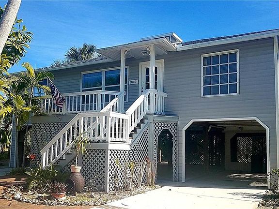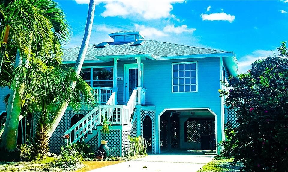 Steps to the beach from this piling home located in Laguna Shores on the south end of Island. Nice open style floor plan has Vaulted ceilings in living room and two skylights. Two open decks one if the front and one in the backside of home. Only one property off of Estero Blvd, deeded beach access is a short walk from this home. Close to Bonita and Naples for shopping and dining. Short bike ride to Santini Plaza, movies, beach bars, restaurants and more! Parking under house for multiple cars, storage areas, and room for a pool in the spacious backyard. Mature tropical landscaping. This home has tons of potential and is ready for updating and personal touch! Priced properly as a remodel ready property. Don't miss out on it!
