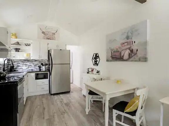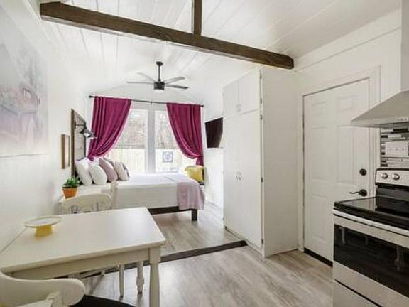 This tiny home was converted from a short-term rental to a long-term rental. It is 288 square feet but has a full kitchen and bath and the high ceilings make it feel roomy. There is a stackable washer and dryer and a large wall-mounted TV. The queen bed frame is built in and will stay, and if you want the small table with 2 chairs to stay, it can. The outdoor yard is surrounded by a 6-foot privacy fence, giving you complete privacy from the other two houses located on the half-acre. (The hot tub is no longer there) You will have a private parking space located inside the privacy fence. The entire property is surrounded by 8-foot deer fencing with a gate.