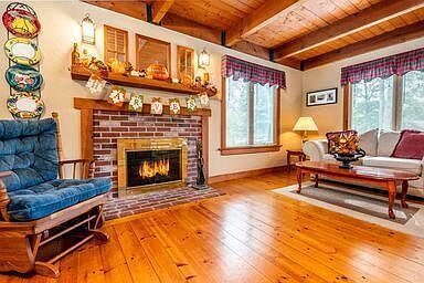 Your wait is over! This gorgeous 3 bedroom 3 bath Cape style home boasting a country flair offers an open floor plan, tongue in groove ceilings, living room with a wood burning fireplace and dining area.This amazing home features a beautiful kitchen with granite counter tops, oversized first floor primary bedroom suite with Jacuzzi and walk-in closet, first floor laundry, large post and beam family room with gas fireplace, a nice private deck and a covered porch.The other 2 bedrooms are located on the second floor. The lower level consist of a den/home office, another family room and the walkout basement.