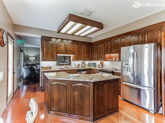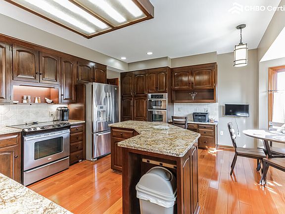 Step inside to discover a transitional decor blending traditional charm with contemporary elegance, accented by hints of industrial flair. The main level features a fully equipped gourmet kitchen, complete with granite countertops, stainless steel appliances, and a large island perfect for food preparation and casual dining. Adjacent to the kitchen, the formal dining room sets the stage for elegant gatherings, while a cozy wet bar offers a convenient space for entertaining.