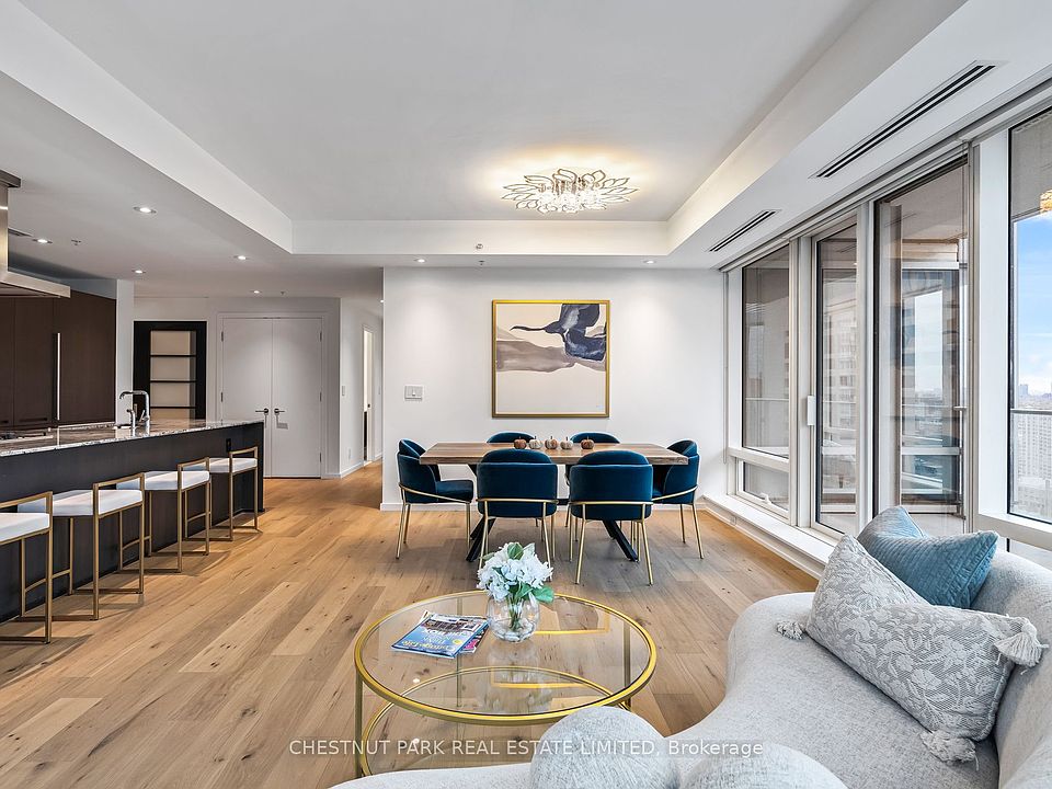 An exceptional residence in the heart of downtown Toronto, this two-bedroom plus private den corner suite at Shangri-La offers nearly 1,800 square feet of refined living space with spectacular north-facing views.Wraparound windows and a well-designed open layout showcase unobstructed vistas up University Avenue, overlooking Osgoode Hall and extending to Queen's Park. The spacious living and dining areas connect seamlessly to the Boffi-designed kitchen, featuring Miele and Sub-Zero appliances, sleek cabinetry, and abundant storage.The primary bedroom offers exceptional views up University Avenue, a large walk-in closet, and a five-piece marble ensuite with a deep soaker tub, glass shower, and dual vanities. The second bedroom also enjoys panoramic views, with double closets and a private three-piece ensuite for guests or family.A private den provides flexibility for a home office, media room, or guest space.Recent upgrades include new hardwood flooring throughout and fresh painting. A large balcony extends the living area outdoors, creating an ideal spot to enjoy the downtown views.Residents of Shangri-La Toronto enjoy world-class amenities, including 24-hour concierge and security, valet parking (pay-per-use), a fitness centre, indoor pool, hot tub, sauna, and steam rooms, along with access to Bosk Restaurant and The Lobby Lounge. Perfectly located near the Financial District, King West, and Toronto's top restaurants and entertainment, this home combines urban convenience with luxury living.
