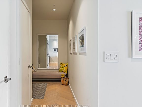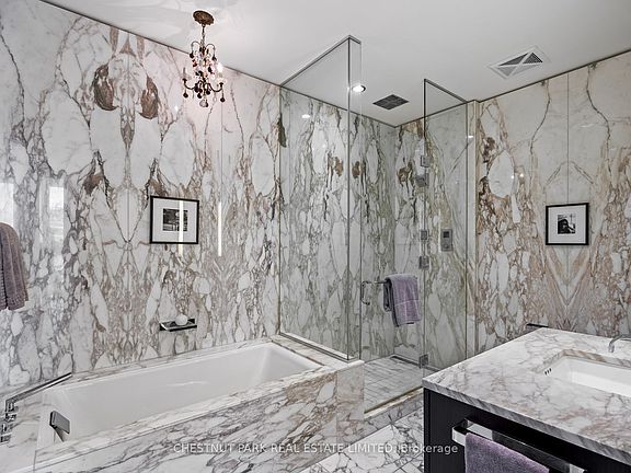 Suite 5707 is a distinguished one-bedroom Private Estate suite above the Shangri-La Toronto, where panoramic skyline and lake views shift effortlessly from sunlit horizons to a dazzling nighttime city glow. With 10-ft ceilings (only for floors 50 and higher), herringbone hardwood floors, and a Boffi Italian kitchen featuring Miele and Sub-Zero appliances, the home combines elegance and functionality. Motorized shades are featured throughout, while custom Poliform closets in both the foyer and bedroom add boutique-inspired refinement. The marble-clad four-piece ensuite is a spa-like retreat with a deep soaker tub, heated floors, and seven-head Kohler DTV digital shower. One parking stall with valet service and a large private locker room adjacent complete this unique offering. Residents enjoy access to world-class hotel amenities and services including 24-hour concierge and security, a fitness centre, indoor pool, sauna and steam rooms, and valet parking (available only to Private Estate floors)all in the heart of Toronto's Entertainment and Financial Districts.