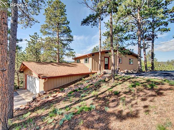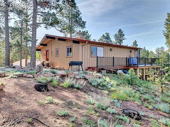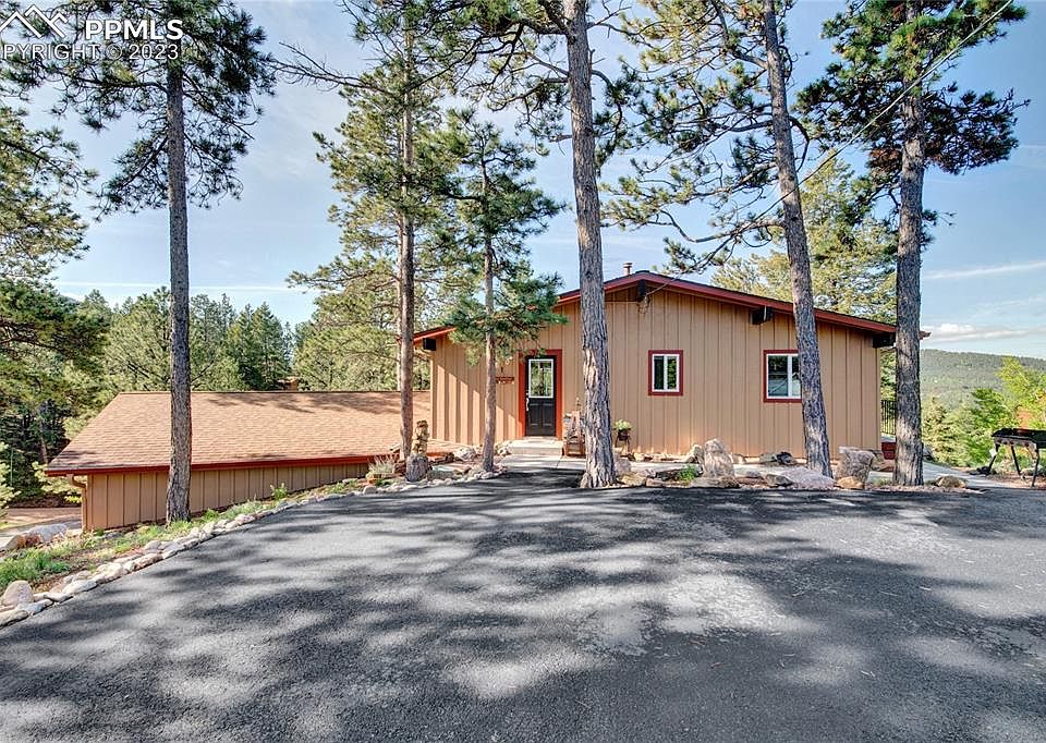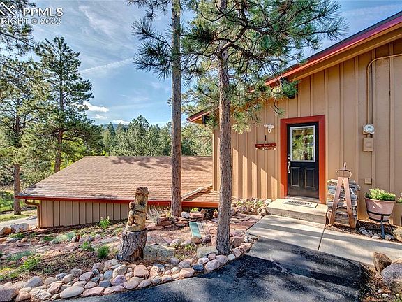 Welcome Home to this mountain retreat on almost a full acre of pine trees and views, views, views from the wrap around redwood deck. The home show cases what we love most about Woodland Park. The unobstructed views of Pikes Peak and sunshine pouring in all of the main level windows. Totally updated gourmet kitchen that is any chefs dream, complete with Granite counters, Pantry w/pullout shelves, Subway tile & soft close cabinets, Silgranite farm sink & more. Breakfast bar provides a transition from the large dining space. This all opens up to the spacious living room w/ cozy gas Fireplace & stone hearth. Flooring is engineered European oak. This space becomes an extension of your living room with big glass doors leading to 12x42 foot deck with a spectacular panoramic view! A wonderful entertaining space! Owners retreat just off the great room is nice and bright w/updated bath, heated tile floor, walk in shower, soaking tub, linen closet, great storage. Going on down the stairway you will find a laundry/storage room, also easy to access utility room w/tankless water heater. and 3 different bedrooms each one with their own bath and two bedrooms have outside access to covered 34x8 foot covered patio. Other room has a built in Murphy Bed and lots of shelving. Southwest bedroom has Radon System enclosed in cabinet & Full bath. There is also an over sized 2 car garage, Seller will leave two top shelving units and work shop table. This home shows pride of ownership through out as you will see for yourself, it is in a prime neighborhood, truly a hikers dream, only minutes to WP for shopping or entertainment, 10 min to Manitou lake for fishing or paddle boarding. Firepit area makes for amazing star gazing nights, this home has it all together. 30 minutes to CS only 1.5 hour to Denver. It's all right here waiting for that special someone to add their touch to what is already a pretty spectacular home. Enjoy for yourself or consider it for STR. Lots of choices, come see!