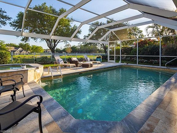 Fabulous single family pool home in the desirable neighborhood of Villa Floresta. Beautifully updated pool deck and lush tropical landscaping. This property has been impeccably maintained. The large screened lanai has a picture window with expansive SW views of golf course and the lake beyond. Fully renovated, furnished and move in ready. The lanai has a generous covered area, perfect for entertaining around the firepit or dining pool-side. The great room has soaring ceilings, built in bar, custom tile floors and is full of beautiful natural light. Lots of areas for you and your guests to lounge about. Enjoy a dip in the pool after golf or relax in the large spa! 3 beds/ 3 full baths. Lovely sunny kitchen with breakfast nook, custom cabinets, stainless appliances, and quartzite counters. The side courtyard is great for grilling out or gardening and the completely fenced in yard is perfect for your pets. Owner’s suite is spacious w/ custom closets, large primary private bath w/soaking tub, separate glass walled shower, dual vanities, and brilliant natural light. Hurricane glass doors, windows and skylights. Separate laundry room, 2 car garage with epoxy floor and private court yard entrance. Enjoy the Southwest Florida lifestyle and live everyday like you are on vacation! This home perfect for you to join in the fun of this amazing club. Wyndemere offers 27 holes of championship golf, 10 har-tru tennis courts, pickleball, bocce, croquet, resort style zero entry pool, fine and casual dining. A state -of -the -art fitness center with group classes and a full service spa, you won’t want to leave the bubble! This 2025/2026 Platinum club has recently reinvented the activity center to include a pickleball stadium, full croquet court, an open air outdoor bar and golf learning center. Wyndemere is conveniently located to all of Naples and our gorgeous sugar sand beaches! Wyndemere is known for its friendly membership and active social schedule of events. A wonderful opportunity to own your own piece of paradise! Enjoy this Southwest Florida lifestyle and live everyday like you are on vacation!