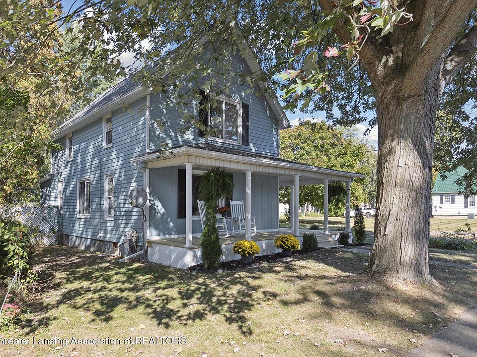 Remarkable two-story loaded with all the upgrades and quality finishes you've been seeking! Roof (2020), furnace & water heater (2024). Offering great curb appeal and lovely wrap around porch. Open, bright & airy layout w/ fresh neutral paint & new luxury vinyl planks, ceiling fans and fixtures throughout! Modern kitchen featuring stainless steel appliances, butcher-block countertops, subway tile backsplash, soft-close cabinetry & new sink/faucet. Formal dining room and eat-in kitchen.Convenient 1st floor laundry & modern half bath.Remodeled full bath w/ new vanity, fixtures, & subway tiled shower. Plush carpet & ample closet space in all 3 bedrooms. Michigan basement & detached 1 car garage offering great storage space. Back deck overlooking the fenced backyard. See complete updates list