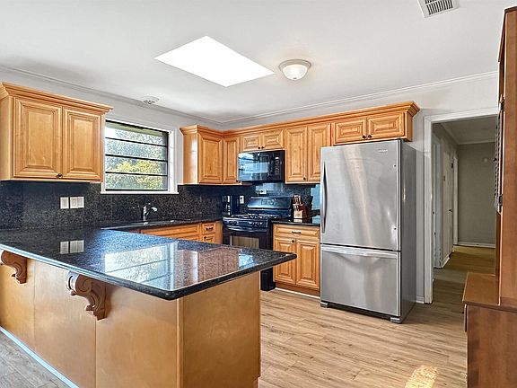Large fenced yardLow-maintenance brick exteriorGas stoveStained cabinetsSlab granite countertopsStorage buildingUpdated kitchen