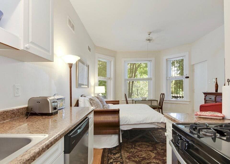 A fully furnished studio on the first floor of a classic Victorian era DuPont Circle building. The home is fully appointed for a seamless stay with a queen size bed, upgraded kitchen, in unit washer and dryer, central heating and air and has excellent light from the front facing windows. Hardwood floors give the feel of the authenticity of Dupont Circle.