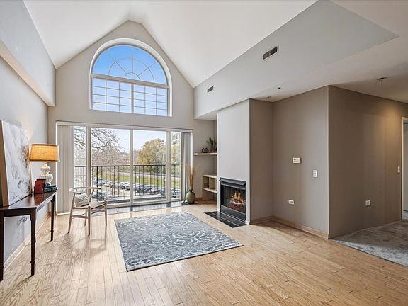 Perfectly positioned in the heart of downtown Glenview, this sun-splashed condo blends airy volume, architectural charm, and effortless everyday living. A welcoming foyer with hardwood floors opens to a dramatic living room anchored by vaulted ceilings, Palladian windows, a gas ventless fireplace, and sliding doors that usher in fresh breezes from the Juliette balcony-an ideal perch for morning coffee or golden-hour unwinding. The adjacent dining area, crowned by a skylight and recessed lighting, flows seamlessly into the well-appointed kitchen featuring granite countertops, ceramic tile flooring, soft natural light from yet another skylight, and a full suite of GE appliances. The private wing hosts a serene primary suite with a walk-in closet and an en suite bath offering a dual vanity, ceramic tile shower, and abundant skylight illumination. A spacious second bedroom and full hall bath create perfect separation for guests, work, or hobbies. Additional conveniences include in-unit laundry, same-floor storage, and two coveted parking spaces. New carpeting, thoughtful built-ins, and a location steps to dining, shops, transportation, and all the vibrancy of Glenview's urban core make this home a standout for those seeking style, ease, and proximity to everything.