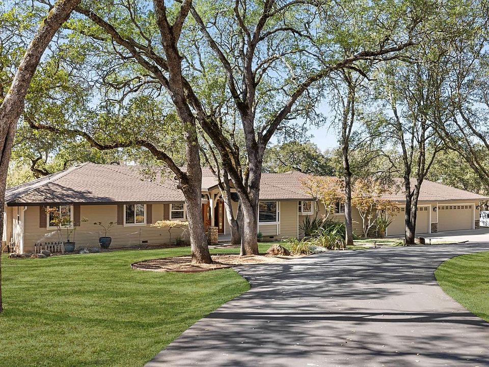 Back on market! No fault of seller! Nestled in highly sought after, Green Springs Ranch, this beautifully updated single-story 4-bedroom, 3-bathroom home offers a perfect blend of luxury and functionality on a flat, fully usable 5-acre parcel. Inside, the home features modern updates with elegant alder wood cabinetry throughout, luxury Thermador appliances, and a water softener system. Outdoors, enjoy the low-maintenance, expansive Trex decking, perfect for relaxing and entertaining. The property includes a massive 1,400 sq. ft. 4 car garage and a paved semi-circular driveway. Equestrian enthusiasts will love the 2-stall barn, complete with tack room, hay storage, and wash rack. The barn is outfitted with electricity, fans, water and can easily be converted to a shop. The pastures are cross-fenced and there is an oversized round pen. This gorgeous property offers plenty of room for adding a pool, gardens, or additional recreational features to make the most of this usable acreage. This serene and private retreat, zoned for Oak Ridge High School, combines luxurious living with practical amenities in an ideal location! A must-see for those seeking the perfect blend of rural charm and modern comforts!