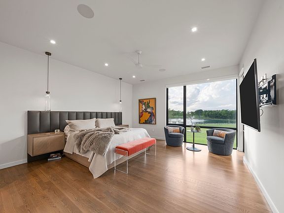 Step inside to discover a warm and sophisticated interior featuring rich white oak hardwood flooring, motorized window shades, and a dramatic 20’ motorized glass wall opening to a fully conditioned porch—perfect for year-round enjoyment. Centered around a sleek 6’ linear propane fireplace with remote and blower, the open-concept living space shines under the glow of exquisite Reng handblown glass lighting imported from France.