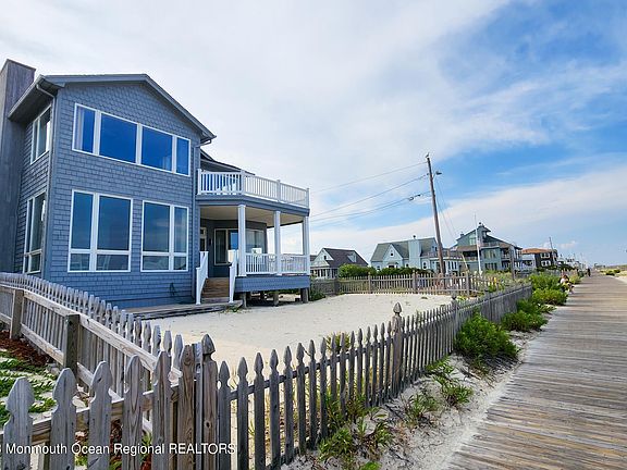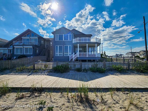 This turnkey oceanfront home was built with foresight...up high...with 2 garages underneath, ocean views from the first floor, and over-sized windows that showcase expansive ocean views. Nine foot ceilings on the first floor add to the voluminous and spacious feeling in the living, kitchen, and dining areas. First floor also offers 2 bedrooms plus 1 1/2 baths. Second floor has an outside entrance and/or a lock out interior option and is connected by a beautiful curved staircase leading to the second floor which offers panoramic views, cathedral ceiling in the living room, another dining room and kitchen, 3 additional bedrooms and 2 more baths. Each floor also has an oceanfront spacious deck. This property has been family owned since built and lovingly cared for