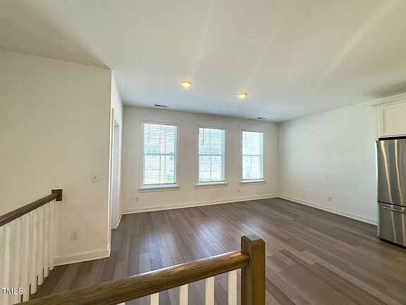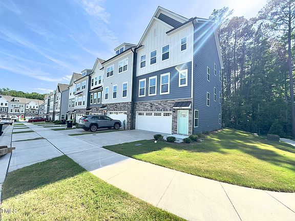 Discover this beautiful 3-story end-unit townhome in the sought-after West Village community of Apex. Built in 2021 and thoughtfully maintained, this spacious home offers nearly 2,450 sq ft with 3 bedrooms, 3.5 baths, and a 2-car garage blending modern design with everyday comfort. The first floor features a large bonus room with a full bath, perfect for overnight guests, a home office, gym, or game room flexible to suit your lifestyle. The second floor boasts an open-concept layout with a bright and airy family room, a spacious dining area, and a modern kitchen complete with granite countertops, tile backsplash, a large island, and stainless steel appliances ideal for both cooking and entertaining. Upstairs, the primary suite offers a peaceful retreat with a walk-in closet and a luxurious bath featuring a frameless glass walk-in shower and dual vanities. Two additional bedrooms, a shared full bath, and a laundry closet complete the third floor. Enjoy outdoor living on the oversized deck, overlooking a private wooded area, with additional green space on the side of the home. The community offers excellent amenities including a swimming pool, playground, and sidewalk-lined streets. Located just minutes from Pleasant Park, Beaver Creek shopping center, Publix Pointe, Costco, and with easy access to Hwy 540, this home offers the perfect combination of convenience, privacy, and modern living in a prime Apex location.