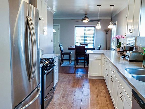 Turn Key Turn Key!!..I am so Proud to Present this Beautiful Home to the Community the upgrades and finishes are impeccable. This 3bedroom and 1 & 1/2 bathrooms offers a new carefully thought out floor plan which brings new walnut floors throughout and textured wood flooring in the kitchen and bathroom. Beautiful crown molding top and bottom in every room a open airy kitchen with new quartz counter tops and brand new white quiet closing cabinets & new stainless steel sink and dish washer and stainless steel oven exhaust vent with digital timing system new stainless steel stove, new washer and dryer hook up located conveniently inside of the home off the kitchen, sensor lighting in the new guest bathroom, beautiful bathroom with dark wood cabinets new tile in the shower, new carpet and paint, new double paned security lock windows and new roof, water heater, new copper plumbing, nice spacious backyard with added lattice for privacy drainage system in the ground new cemented area great for bar b q area and cemented pathway that leads to the detached 2 car garage that is finished on the inside there is so much more to mention it is a definite a Must See to Appreciate! Also No City Presale Inspection needed it has been done and has passed along with all permits.
