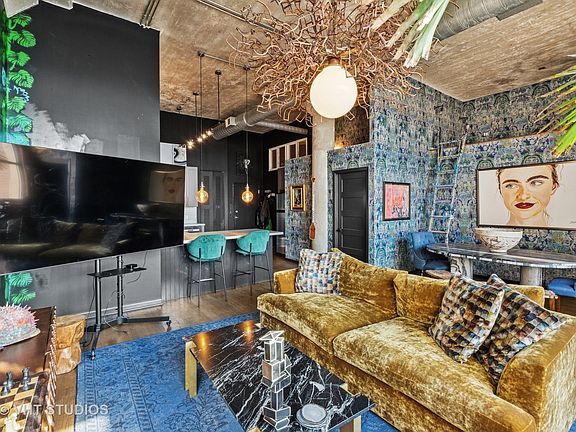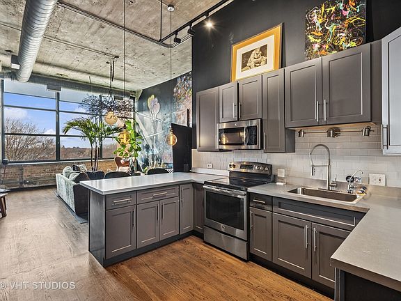 Experience loft living at its finest in this stunning 5th-floor unit at Pencil Lofts perfectly positioned between the vibrant retail hubs at Damen & Roscoe and Lincoln & Roscoe. This 2-bedroom, 2-bathroom + lofted den has been completely reimagined with high-end finishes and modern design. Step into a custom-designed kitchen featuring sleek cabinetry, stainless steel countertops, newer appliances, and detailed lighting that adds a touch of sophistication. The newly updated bathrooms boast designer lighting, marble-topped dual vanities, and elegant white subway tile shower surrounds. Soaring concrete ceilings and floor-to-ceiling west-facing windows flood the space with natural light, offering breathtaking Roscoe Village views and spectacular sunsets. The open-concept living and dining areas provide a warm and inviting atmosphere-perfect for entertaining. A unique lofted den overlooks the main living space, offering endless possibilities as a home office, creative studio, or cozy retreat. The primary suite is a showstopper, housed in the building's former elevator shaft, evoking an authentic New York loft feel. It features over 15 feet of linear closet space and a beautifully renovated en-suite bath. The thoughtfully designed second bedroom boasts soaring ceilings, built-in storage, and a lofted nook, making it both functional and stylish. Additional highlights include a full-size side-by-side laundry room with extra storage, a heated attached garage space, and access to fantastic building amenities, including a rooftop deck with skyline views, a gym, and a newly updated brick paver grill patio.There's nothing left to do but move in and enjoy the best of loft living in the heart of Roscoe Village!