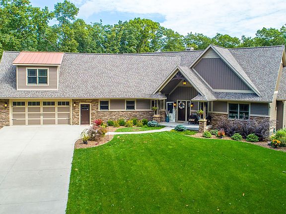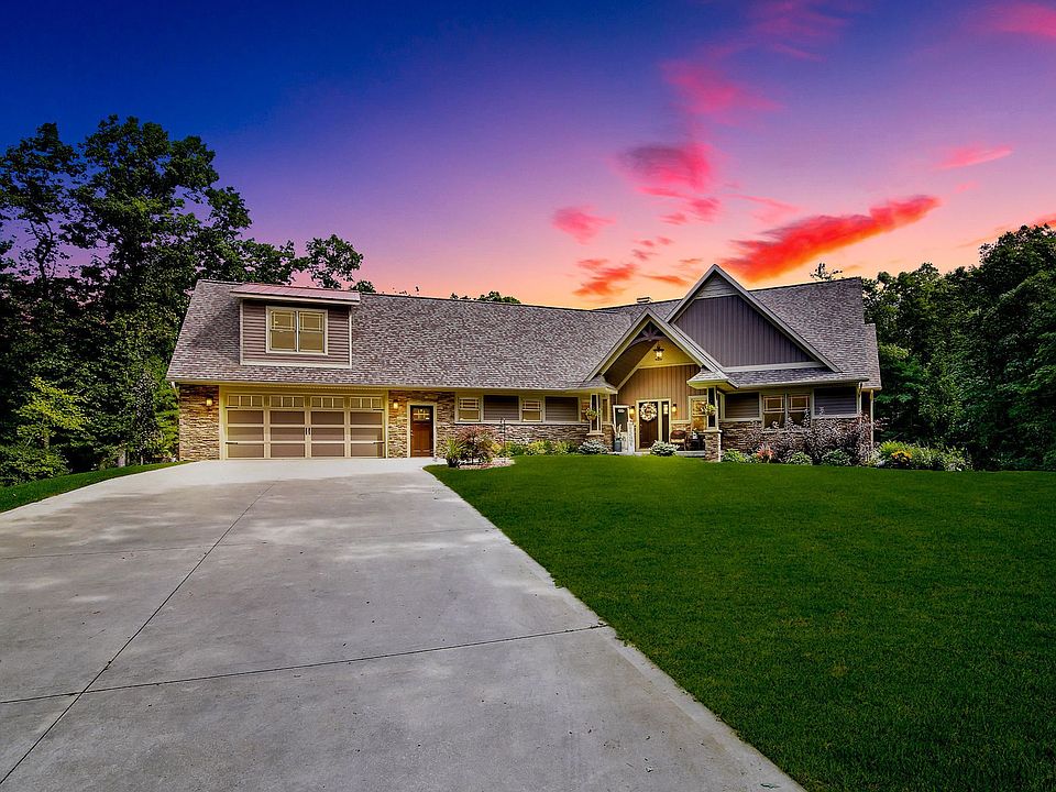 Rustic Luxury and Design sitting on almost 6 acres of serene privacy. This 6 bd, 51/2 bath, almost 5,000sf Custom Designed home is the perfect mix of extreme quality and functional living. The great room and open concept kitchen are complimented by soaring ceilings and a rustic stacked stone fireplace with the finest accent features. The main floor has 3 Bds, including the Master wing featuring resort style bathroom. Upper level hosts a theatre/exercise studio and the lower level stuns with 2 more spacious bds, family room and completely separate guest quarters with its own kitchen, bd suite, laundry, and attached 3 stall garage(5 total)! Outside you will find your own backyard oasis featuring the best in outdoor entertainment, firepit, TV, wet bar, and built in stainless steel appliances.