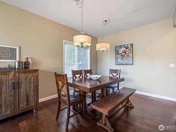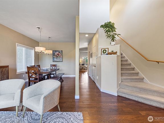 Exceptional 4 bedroom home featuring an impressive outdoor living room & detached two-car finished garage offering versatile space, perfect for a gym or workspace. Hickory hardwood floors greet you in the living & dining dining rooms & extend to the nicely refreshed eat-in kitchen equipped w/ double ovens. Family room w/ a gas fireplace & french doors open to a dedicated home office or playroom. The outdoor living space boasts a gas fireplace, double infrared gas heaters, TV & built-in BBQ. All 4 bedrooms located on the upper level, along w/ convenient laundry room. Primary suite w/ walk-in closet & 5 piece ensuite & view of Mt. Rainier. Two other east-facing bedrooms also share this stunning view. Attached 2 car garage w/ custom cabinets.