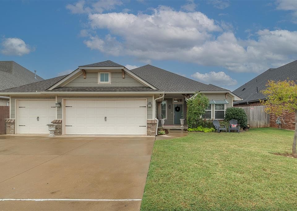 Beautiful 4-bedroom home with a study, located on a quiet cul-de-sac in The Grove Addition. Offering 2,143 sq ft, this open floor plan features a spacious living room with fireplace, a bright kitchen with granite countertops, stainless steel appliances, large island, and plenty of storage. The private primary suite includes dual sinks, a soaking tub, shower, and large walk-in closet. Three additional bedrooms plus a versatile study provide flexible space for family, guests, or a home office. Step outside to the covered patio and enjoy the custom outdoor fireplace, perfect for relaxing or entertaining year-round. The Grove neighborhood offers unmatched amenities including pools, fitness center, walking trails, and playgrounds, all within the Deer Creek School District. Move-in ready and perfectly located!
