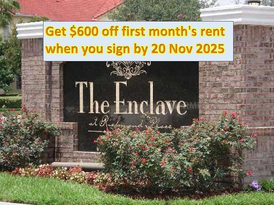 The Enclave at Richmond Place, Gated Community. Spacious 2-bedroom, 2-bath apartment has a living and dining room that feature durable laminate floors and balcony views. The kitchen has a tile back splash and breakfast bar. The master bedroom has two large windows, ceiling fan, and a walk-in closet. The open floor plan boasts a separate laundry room, dining area, kitchen with appliances and a breakfast bar, living area with sliders to the balcony.