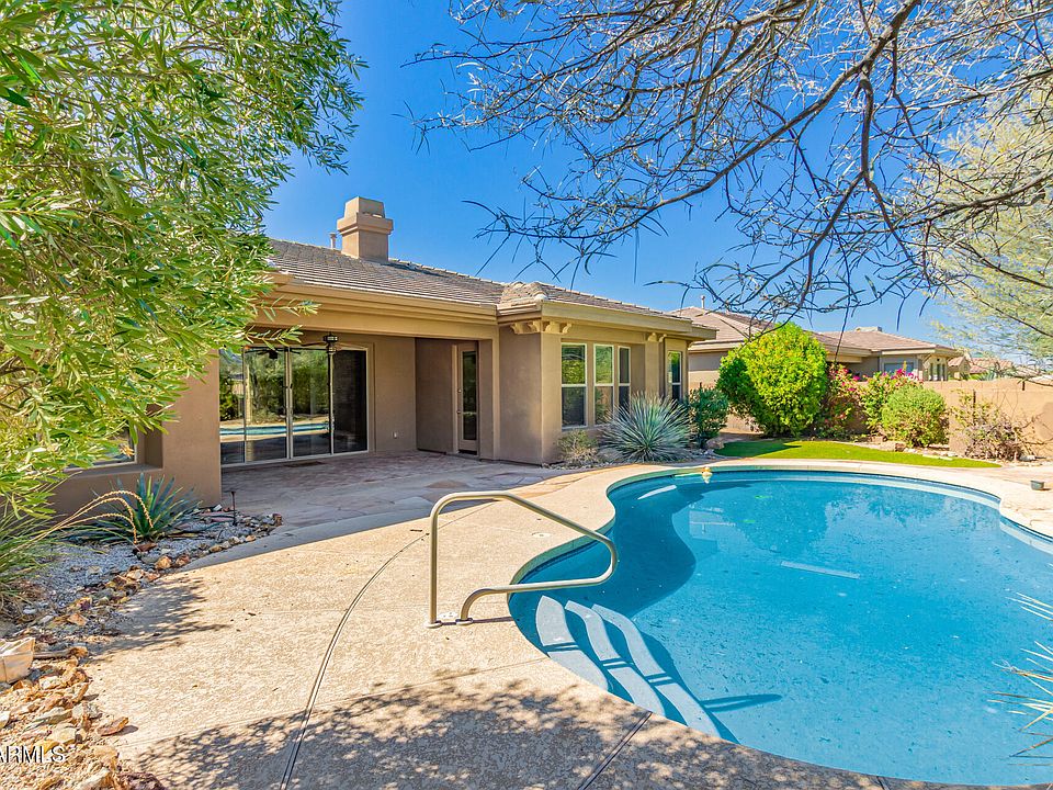 Private poolExterior fireplaceLow-maintenance desert landscapingCorner lotBrick-accented courtyardGranite kitchen islandGuest ensuite
