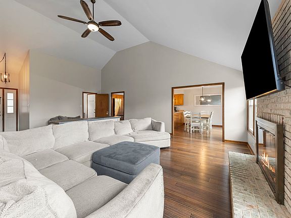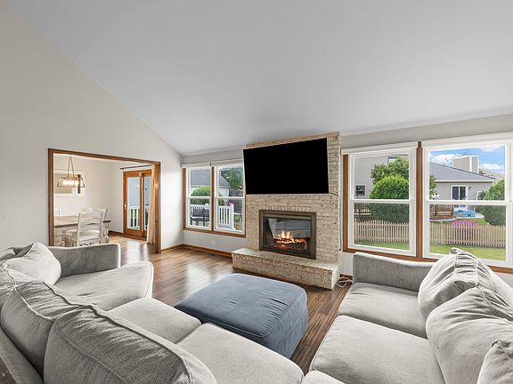 Nestled in Plainfield's desirable Brighton Lakes neighborhood, this charming ranch home offers 3 bedrooms and 2 bathrooms in a bright, open layout designed for comfort and convenience. Easy one-story living - the home even has a sloped path to the front door, zero steps! Venture into the inviting living room, where vaulted ceilings, a cozy brick fireplace, and abundant natural light create a warm and airy atmosphere. The large kitchen provides ample cabinet and prep space, flowing seamlessly into the dining area, which is ideal for everyday meals or entertaining guests. Outside, a large maintenance-free Trex deck extends from the kitchen and is perfect for grilling or relaxing. Conveniently located just off the main living area is a first-floor laundry room and mudroom. The spacious first-floor primary suite boasts a private ensuite bath and a generous walk-in closet, while the unfinished basement presents endless possibilities for future living space or storage. Just minutes from downtown Plainfield, this home offers easy access to shopping, Metra transportation, and top-rated District 202 schools, including Wesmere Elementary, Timber Ridge Junior High, and Plainfield Central High School. The HOA provides access to a clubhouse, sand volleyball courts and an amazing neighborhood pool, adding to the community's many amenities. So much NEW: 2025 - Dryer; 2024 - Refrigerator + Washer; 2022 - Trex Deck; 2020 - Sump Pump; 2019 - Windows + A/C Unit; 2017 - Roof. Come and check out this beautiful home!