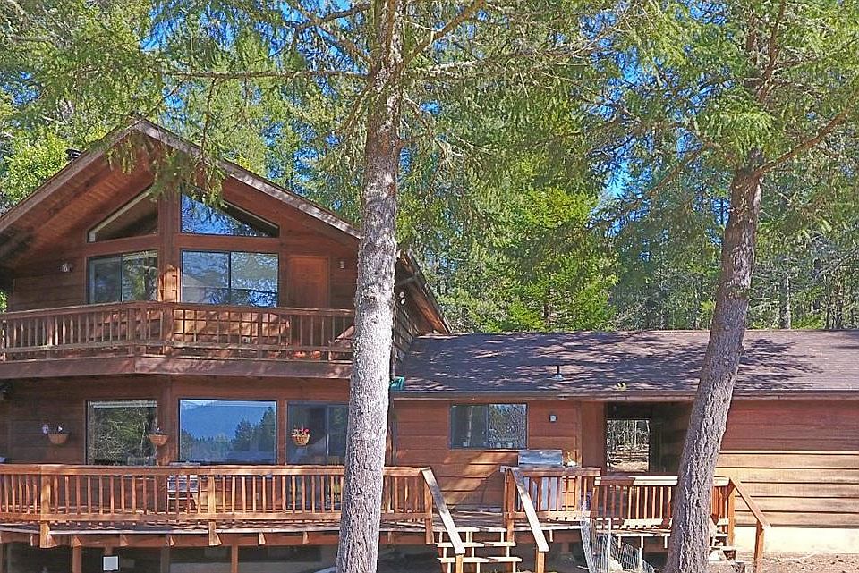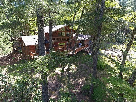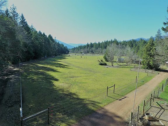 Seclusion awaits you down this 1.8 mile unpaved road. Great for your horses and/or animals. This hideaway is tucked in the forest but has an open view of Eight Dollar Mountain and open pasture area (approx. 6 acres). There is fencing, horse corrals, a small barn and 40x24 shop. The second dwelling is an older but quaint cabin. The home is 2-story with master suite and bath upstairs with a wall of windows, skylight and upper deck looking out to Eight Dollar Mountain. This home is equipped with see through blinds affording you view but also blocks the summer rays. A large deck off the main living room for those long summer nights and BBQ's. The bedrooms have cherry wood flooring. There are a couple horse shelters and a round pen. Glass greenhouse to get a headstart on your garden. Seasonal creek and pond. There may be water rights of approx. 6 or 7 acres, buyer to do own due diligence research regarding same.