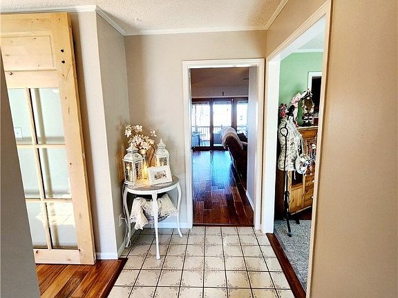 This home welcomes you with warmtones, wood plank flooring, and carpet in bedrooms. Remodeled kitchen with cabinets, appliances, and stone countertops. Kitchen opens up to formal dinning with glass barn door or to eat-in breakfast area. In living room a great corner fireplace. With bonus room that would be great for a family room, sitting room, or craft room. 2 large spare bedrooms with Remodeled bathroom. Off living room glass slider entry to back deck. In the split floor plan primary bedroom is located off kitchen. Within another private glass slider entry to back deck. Ensuite bathroom includes his and hers closets.