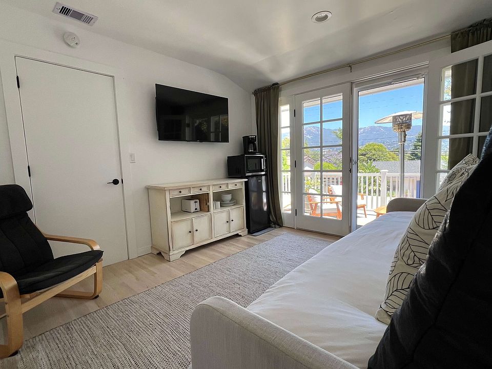 Private, light filled master suite for rent in a newly and fully renovated home. 1.4 miles from the beach in a safe, walkable and quiet neighborhood, and only 1.5 miles from downtown. Free and safe street parking directly in front of property. Located at the back of Elings park and the Mesa with a 2 minute drive to Mesa shopping, a 3 minute drive to Cottage Hospital and San Roque shopping, or 5 minutes to downtown restaurants and shops. Steps above street level and away from all passerbys, a private viewing deck extends the living space outdoors and leads you to your master suite via an independent entrance. Fully furnished room including large daybed/trundle (2 twin size mattresses, brand new and highest quality for best night's sleep), with attached ensuite bath including a walk-in shower with zero floor entry and large walk-in closet for plenty of storage including a small kitchenette for reheating and cold storage. Mini fridge, coffee pot and convection oven/microwave in room. Please note: no hot plate allowed. This is not a unit conducive for cooking only simple preparations. Large french doors open to sweeping mountain and city views. Shared laundry room. Owners live and work on-site in main, attached house. 2 indoor only cats also live on-site. Month to month contract. All utilities included. Housecleaning included every other week. No pets allowed. (There are 2 cats on-site). No smoking on or near property. Free street parking. First month's rent and security deposit due at signing. Plus a $200 non-refundable cleaning fee. 1 person occupancy only. Day guests solely, no overnight guests. Quiet hours observed strictly 10pm-8am.