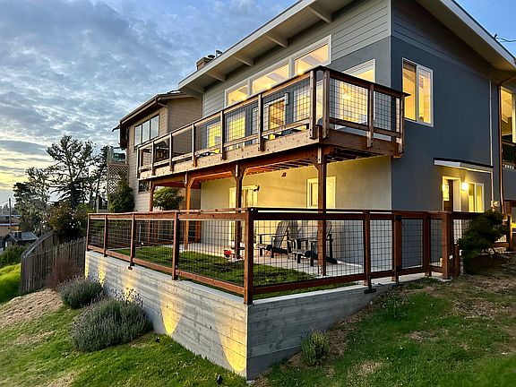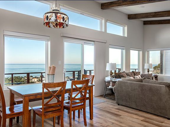 The lower studio, accessible down exterior steps through its private entrance, boasts a bedroom with the same awe-inspiring views as the upper level, and now, a luxurious California king bed. Slide open the glass door to step onto an outdoor concrete patio with a fenced in grassy yard. Observe deer gracefully traversing the meadow below, while the white water crashes on the rocks off the coast truly an unparalleled view on the central coast.