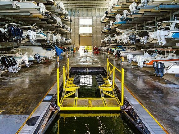 The Port Marina is 5 minutes to the ocean, the closest Marina / Dry-Stack storage to Port Everglades. Top level slip accommodates max 42' length, beam 14.5', height 16.5', 32,000 lb lift capacity. State of the art boat launch with Bridge Crane lifting system, fresh water wash down system prior to racking includes brushing scum line. Inside lounge area, with showers and outside picnic tables. Free ice for storage customers. Storage lockers upon availability. Convenience Rack can be scheduled to detail your boat or bring in a subcontractor.
