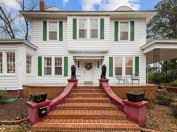Welcome to the grand and gracious Pate-Simon home, a stand-out in the Historic Ghent neighborhood, just one mile from Historic Downtown New Bern. With over 3,200 square feet of exquisite living space, this absolutely beautiful home boasts ten-foot ceilings upstairs and down and recently refinished original wood flooring nearly throughout the home. There are five large bedrooms, two and a half baths, a den, an office, and a truly stunning (and large!) sunroom that will quickly become your favorite room in the home. There's a large basement with fairly easy access, and walk-up stairs to the attic. This corner home is positioned in the center of two extra-large lots, meaning extra outdoor space for play and landscaping, as well as just plenty of elbow room. There's paved off-street parking, as well as driveway entry from two sides of the home and covered parking. Refrigerator, washer and dryer, and elegant window treatments convey. A 2-10 one-year home warranty comes with the property.