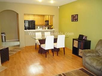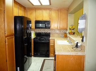 Air-Conditioned townhouse with two car attached garage Not Specified unit 2-car Garage parking. Air-Conditioned townhouse with two car attached garage, laminate wood and tile flooring, stone tile countertops with natural wood cabinets and black appliances in kitchen including refrigerator, stoveoven, dishwasher and built-in microwave. Separate laundry room in unit with washer and dryer. Master bedroom features walk-in closet , and master bath has sink including vanity and tubshower combo. Two bedroom share Jack and Jill bath and there's a large loft upstairs, plus an extra-large fenced patio in back. Other features include ceiling fans throughout, wall insert area for your entertainment center. Community offers pool and spa amenities and additional permit parking for guests. Walk to elementary schools across from complex entry. Close to shops, restaurants and toll road. Will allow up to two small pets under 25lbs.