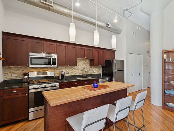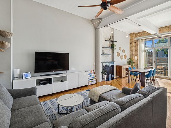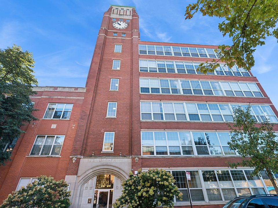 Loft living at its finest in this rarely available 2 bed/2 bath move-in ready unit in the iconic Bell and Howell lofts in the heart of North Center! Enter and find soaring 13 ft ceilings, exposed brick, and a private south-facing balcony. Spacious, light-filled open layout with flexible living and dining room spaces, hardwood floors throughout, gas fireplace, and an open concept kitchen with black granite counters, stainless steel appliances, abundant cabinetry + pantry, and a butcher block island with seating. The spacious primary bedroom has been fully enclosed with paneled windows allowing natural light to filter through. The large walk-in closet leads to a stunning 2024 renovation of the primary ensuite bathroom featuring new tub and matte black fixtures, new shower tiles & floor tiles, new mirrors, and a refreshed dual vanity with updated quartz countertop, double sinks and faucets. The in-unit washer/dryer is conveniently placed right outside the primary suite. The second bedroom is ideal for guests or a dedicated office, and is also fully enclosed with full height walls and paneled windows allowing for extra privacy. Additional updates include freshly painted walls and buffed hardwood floors (2020), new stove/oven (2024), in-unit washer/dryer (2020), A/C (2019), water heater and dishwasher (2016). A secure gated parking space conveniently located close to the building entrance is included in the price, and your guests will appreciate the on-site visitor parking. There is both a passenger and freight elevator for convenient moving, two bike rooms, and a renovated mailroom and lobby with secure entry. Reasonable assessments in a well-run building with cable, internet and parking all included in the assessment. Residents have access to an amazing common rooftop deck with a grill, lounge seating, sweeping skyline views, trex decking, common area bathroom, and the building's beloved clock tower. Located in the coveted Coonley School District, with the Brown Line, Metra, Trader Joe's, parks, restaurants, breweries, and all that North Center offers. This unit has a rare combination of historic loft character with modern comfort in a hard to beat location!