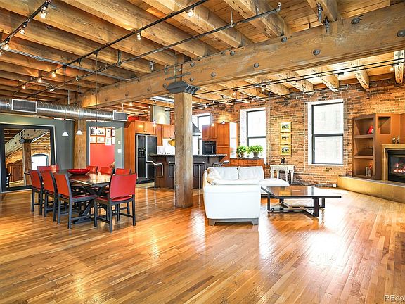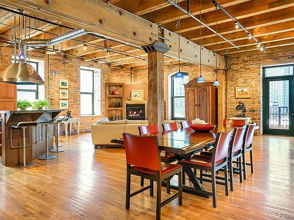 An open floorplan unfolds w/ floor-to-ceiling brick walls complemented by hardwood flooring. Exposed wooden beams and draw the eyes upward as natural light pours in through expansive windows throughout. A center island w/ seating grounds a bright kitchen showcasing and warm wood cabinetry. Ambiance emanates from a fireplace surrounded by built-in shelving in a spacious living area. Open a glass door to reveal access to an outdoor balcony boasting city views. Relaxation awaits in a primary suite w/ a walk-in closet and a serene bath w/ a walk-in shower. Ideally located at Union Station for quick light rail rides to DIA or Broncos Stadium, residents enjoy easy access to Coors Field, art museums and iconic restaurants and bars.