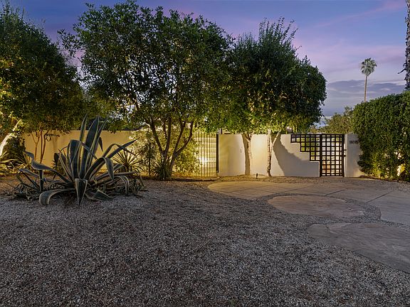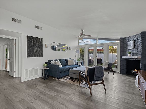 The living area boasts a decorative brick fireplace and seamless flow to the backyard. The primary bedroom offers an en-suite bathroom, a sitting area, and built-in storage, while the second bedroom features a wall of glass. Conveniently located within walking distance to shopping, restaurants, and more, the property is fully walled and fenced for privacy.