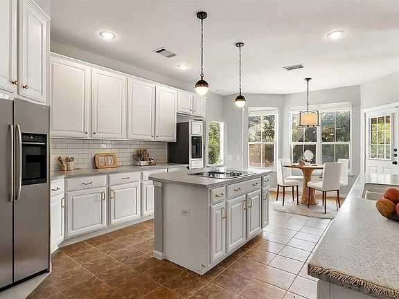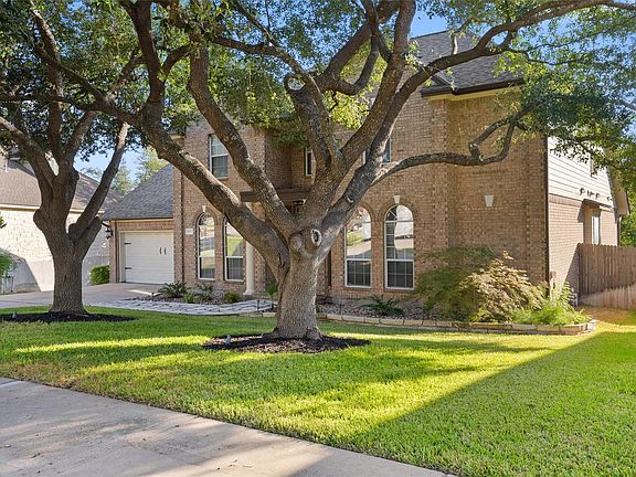 Tucked away on a quiet cul-de-sac, this beautiful two-story home sits on one of the larger lots in the neighborhood and backs to a peaceful greenbelt, offering privacy and plenty of room to stretch out. The curb appeal shines with mature shade trees, a well-maintained xeriscaped front yard, and a charming stone walkway leading to the covered front entry. Inside, the home is bright and welcoming, with high ceilings, large windows, and tile flooring throughout the main living areas. Just off the entryway is a dedicated office with French doors and built-ins plus a formal dining room with crown molding and great natural light. The spacious living room features soaring ceilings, a ceiling fan, and a seamless flow into the kitchen and breakfast area. The kitchen is well-equipped with a center island, solid-surface countertops, tile backsplash, built-in microwave and oven, and a breakfast bar. The sunny breakfast nook opens to a covered deck that overlooks a large backyard and Greenbelt, a private outdoor retreat, ideal for entertaining or relaxing after a long day. The main-level primary suite offers a peaceful escape with high ceilings, a ceiling fan, dual vanities, a deep soaking tub, walk-in shower, and a generous walk-in closet. Upstairs, you’ll find additional bedrooms and bathrooms along with a flexible bonus space behind French doors—perfect as a game room, media room, or second office. Residents enjoy a true community feel with neighborhood amenities that include a park, playground, and pool. Outdoor lovers will appreciate direct access to the Brushy Creek Regional Trail system, which offers over 7 miles of paved hike-and-bike paths and more than 20 miles of single-track mountain bike trails that weave through scenic greenbelts, creeks, and open spaces. This home is zoned to highly acclaimed Round Rock ISD schools, including Fern Bluff Elementary, Chisholm Trail Middle School, and Round Rock High School—some of the most sought-after in the area.