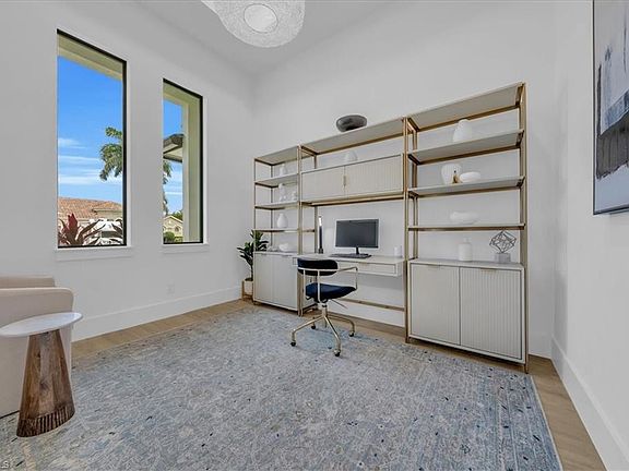 TURNKEY and Ready to Enjoy. Welcome to 18018 Greenwood Drive in Naples, a luxury home where every detail is crafted to make Southwest Florida living effortless. Perfectly positioned with southern exposure and breathtaking lake and golf course views, this property blends elegance, comfort, and resort-style living. Step inside and you’re greeted with soaring 14-foot tray ceilings, custom beams, and walls of impact glass that flood the home with natural light. The open floor plan flows seamlessly with 3 bedrooms + den and 3 full baths, giving everyone their own private retreat. At the heart of the home, the chef’s kitchen impresses with Quartzite waterfall countertops, backsplash wrapping throughout, and top-of-the-line stainless steel appliances including a 36-inch induction cooktop. The walk-in pantry/prep area keeps counters clutter-free ideal for every Costco run. An alkaline reverse osmosis filtration system in the kitchen ensures fresh, purified water every day. The living room’s shiplap fireplace offers a cozy focal point, while floor-to-ceiling sliders open to the lanai where Naples sunsets reflect off the lake and golf course. Entertain effortlessly with indoor/outdoor dining space and a heated pool controlled by AquaLink WiFi. The primary suite is a true retreat, featuring patio access, two custom walk-in closets, and a spa-inspired free-stand alone tub with dual vanities, and frameless glass shower. Guest bedrooms each have their own en-suite bath for privacy and comfort. Filtered shower heads throughout elevate even daily routines. Additional upgrades, The epoxy-coated garage floors reflect heat and resist wear, helping your garage stay cooler with less maintenance. Stucco soffits add durability and reduce heat absorption for lower cooling demand. Low-E impact windows keep UV rays and heat out while protecting against storms, reducing the strain on your AC. Paired with oversized, high-efficiency compressors, your home stays comfortable while using less energy. Even the paver driveway contributes, reflecting heat better than traditional alternatives. Together, these features lower energy costs, extend system life, and provide year-round peace of mind. Located in Eagle Lakes Golf Club, you can enjoy an optional membership with access to the par-72 course, practice greens, driving range, and clubhouse dining. Best of all, this home is just minutes from Downtown Naples, 5th Avenue, Marco Island beaches, and world-class shopping and dining.