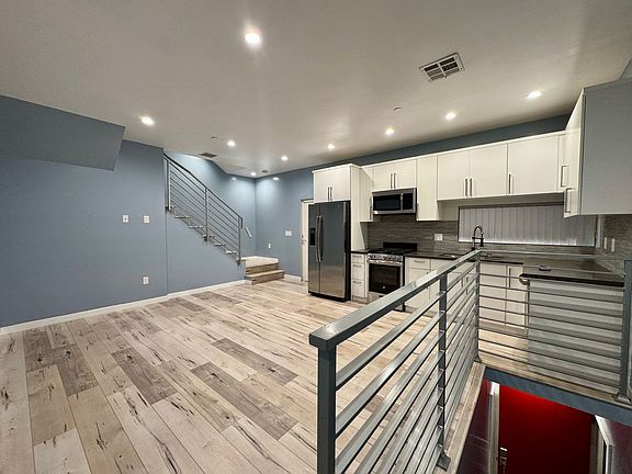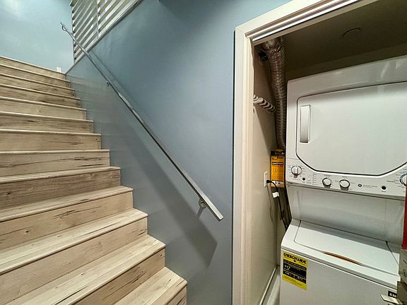Built in 2019, this 2 Bedroom, 1 Bathroom Apartment features Laminate Flooring throughout and Garage. The entrance is found on the first level, where a Washer and Dryer in unit is conveniently found in unit. Upon walking up the stairs to the second floor, the living room awaits with recessed lighting throughout, along with a modern designer kitchen featuring stainless steel appliances and ample cabinet space. The third floor features two bedrooms and a hallway bathroom featuring a standing shower with luxury rain shower head. Small balconies are found by the kitchen and in both bedrooms.